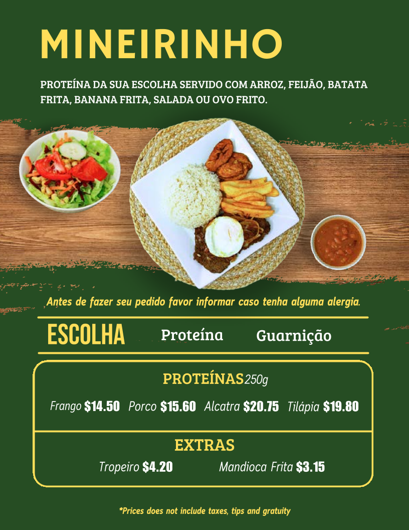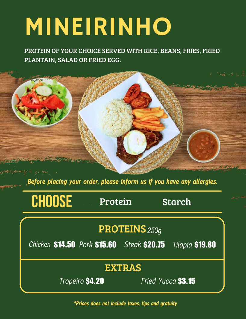 Serves 2. Rice, Tropeiro, Vinagrete and French Fries or Fried Yucca.