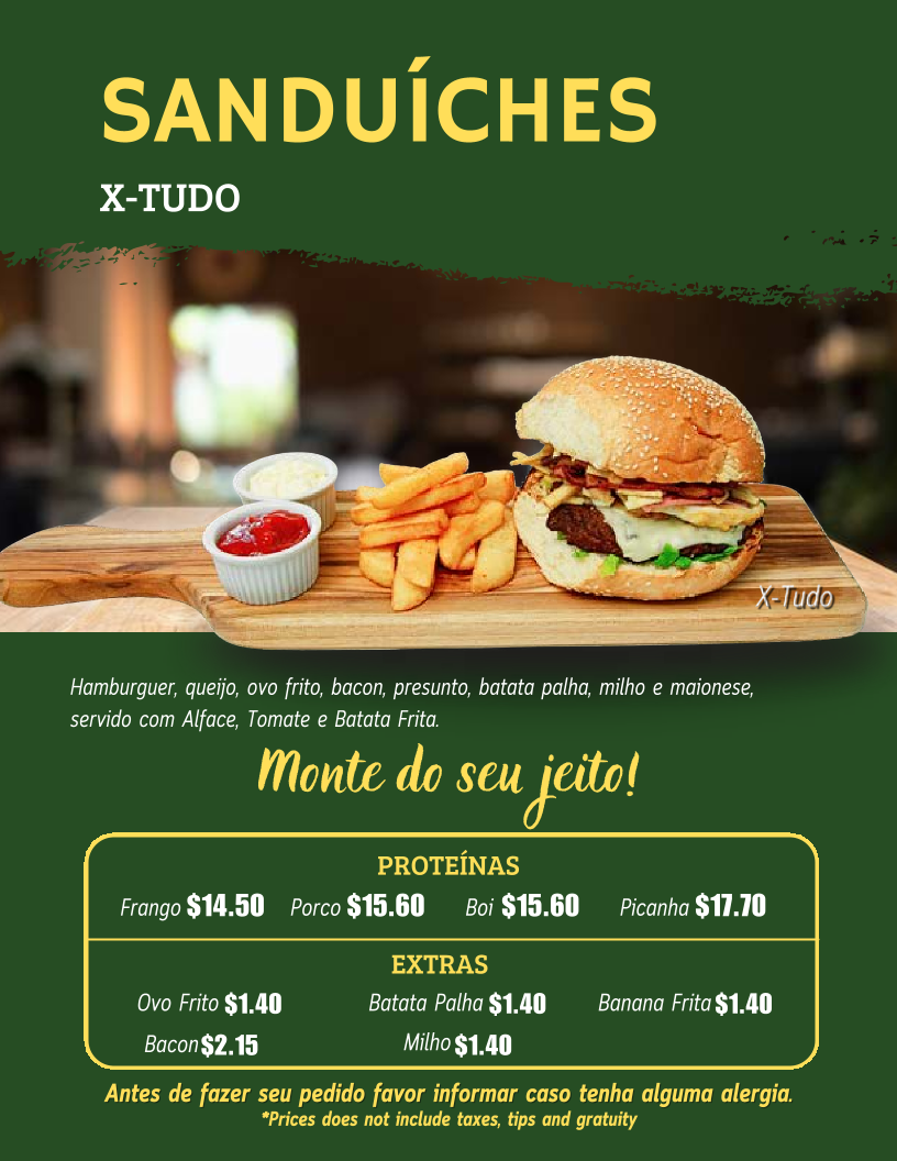 $17.70 depending on protein choice. Patty, cheese, fried egg, bacon, ham, potato sticks, corn and maionese, served with lettuce, tomato and french fries. Make it your way!