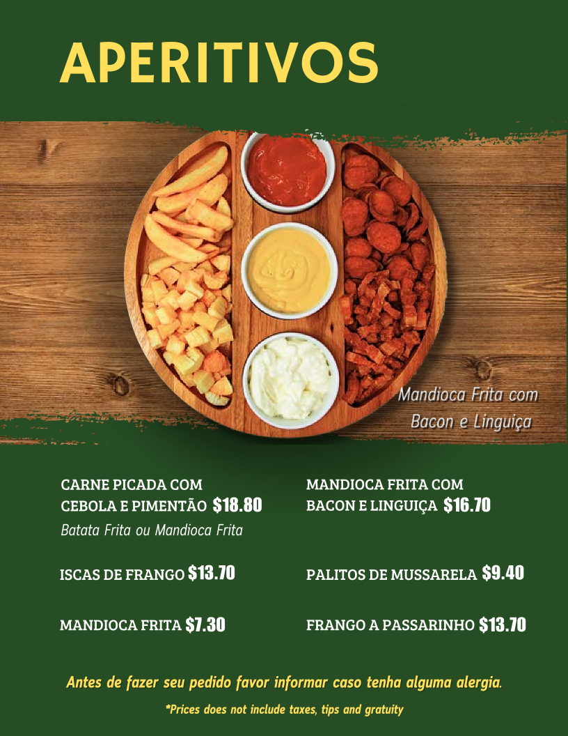 The menu at Sunshine Brazilian Restaurant at 2 Canton St Suite 119, Stoughton, MA, is a vibrant celebration of Brazilian flavors and hearty comfort dishes. The diversity here makes it a true feast for anyone craving traditional home-style meals. Diners can start their journey with APERITIVOS like Carne Picada com Cebola e Pimentão, Iscas de Frango, or the indulgent Mandioca Frita com Bacon e Linguiça - all perfect for sharing and pairing with a cold Guaraná Lata or Suco de Laranja.